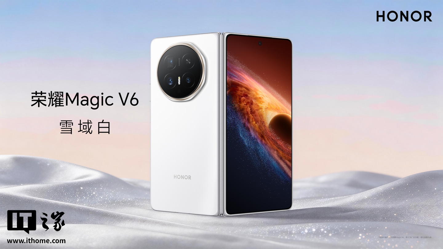 IT之家 3 月 13 日消息,荣耀 Magic V6 将于今日 10:08 全渠道正式开售,搭载满血第五代骁龙 8 至尊版处理器,1TB 版本内置 7150mAh 青海湖电池,提供赤兔红、旭日金、雪域白和绒黑色四种配色: