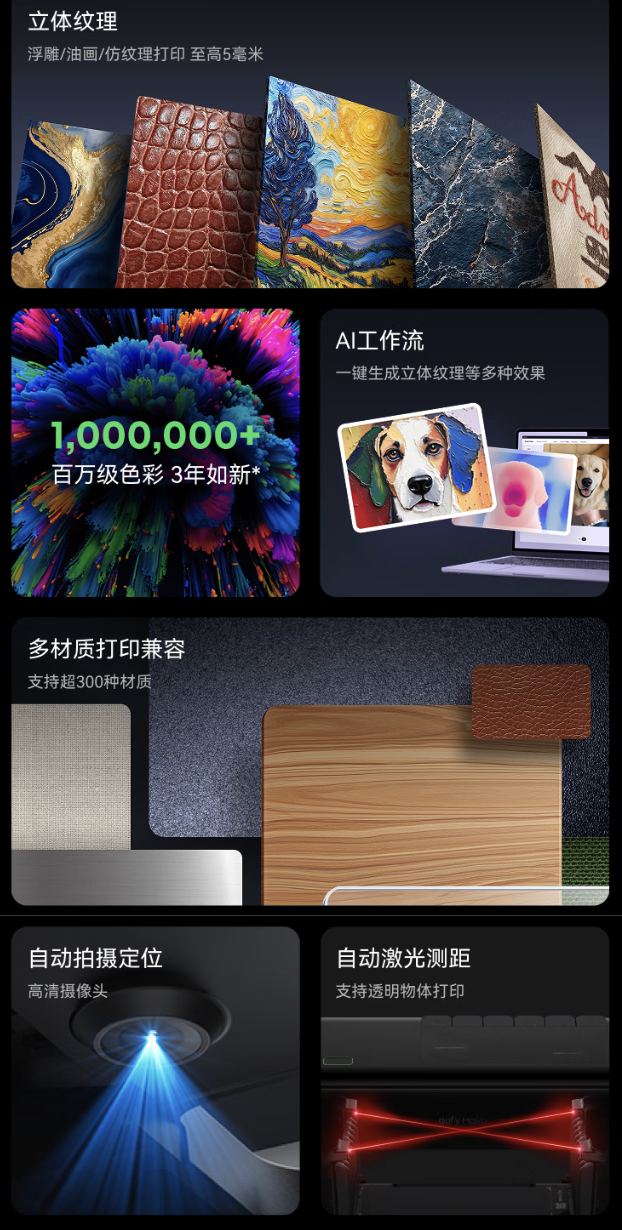 其可在金属、玻璃、亚克力、木质表面印刷,可模拟油画笔触、皮革压纹等质感,印刷高度可达 5mm;同时该打印机随附的应用程序中还带有 AI 创作功能,可供用户生成纹理、浮雕等效果。其支持三种工作模式: