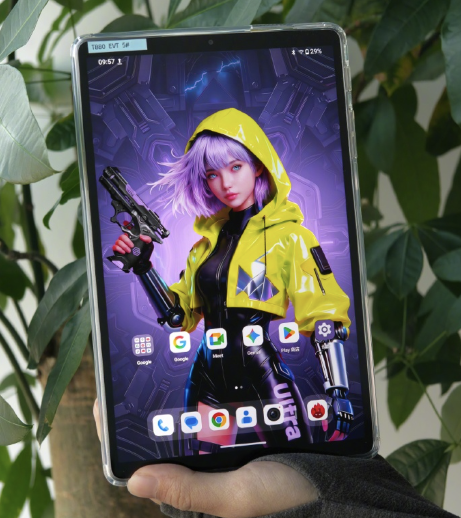 该机整体重量 330 克,厚度 7.75mm,正面配备一块 8.8 英寸 2650x1440 分辨率 144Hz 京东方 LCD 面板(亮度 500 尼特,支持全亮度 DC 调光),机身采用垂直中框,背面使用双摄造型(实际为单摄)。