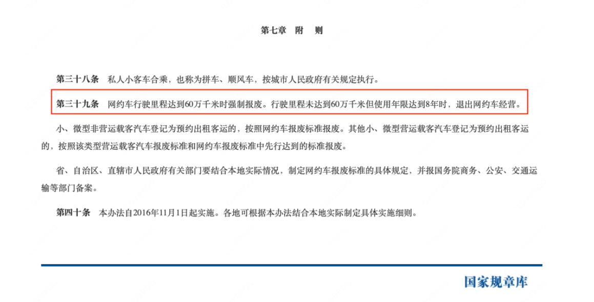 IT之家注意到,根据交通部《网络预约出租汽车经营服务管理暂行办法》第 39 条,“网约车行驶里程达到 60 万千米时强制报废。行驶里程未达到 60 万千米但使用年限达到 8 年时,退出网约车经营。”各地交通局也会定期注销已超出 8 年营运年限车辆的运输证。