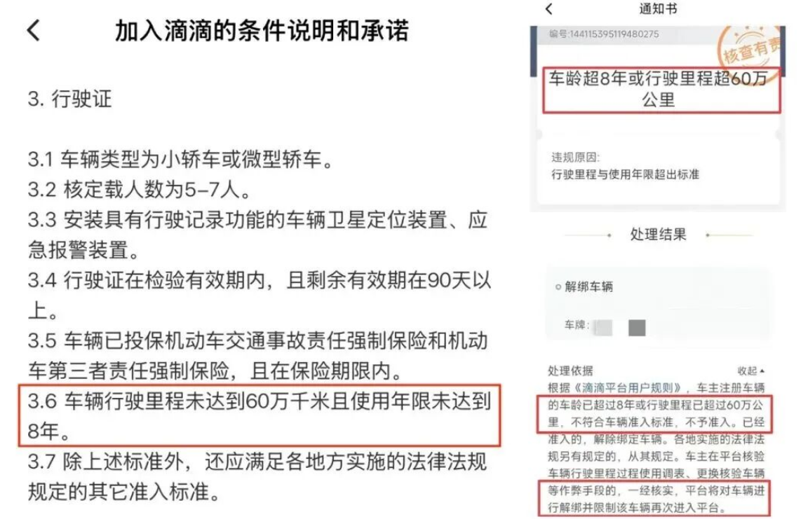 《滴滴平台用户规则》和车主端《加入滴滴的条件说明和承诺》均明确说明,车主注册车辆的车龄已超过 8 年或行驶里程已超 60 万公里,不符合车辆准入标准,不予准入。滴滴称,公司严格遵循国家法规和各地监管要求,司机端系统自动识别车龄,超 8 年的车辆无法正常注册绑定出车,无任何“超龄车违规延期”“内部特殊通道”等政策,所谓“放宽条件”均为虚假信息。