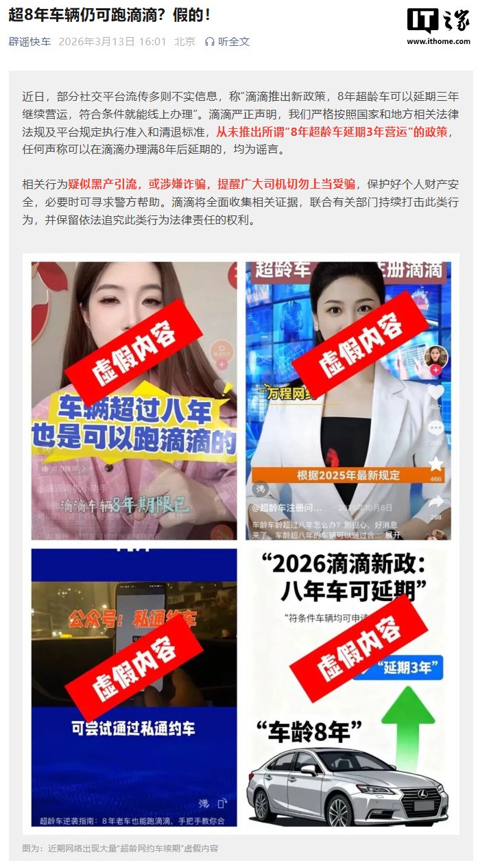 IT之家 3 月 13 日消息,滴滴“辟谣快车”官方公众号今日发文称,近日,部分社交平台流传多则不实信息,称“滴滴推出新政策,8 年超龄车可以延期三年继续营运,符合条件就能线上办理”。