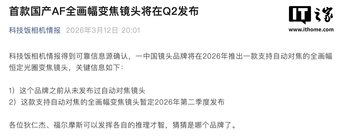 IT之家 3 月 13 日消息,消息源“科技饭相机情报”昨天在公众号平台发文称,某中国镜头品牌将在今年推出一款支持自动对焦的全画幅变焦镜头。