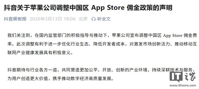 IT之家 3 月 13 日消息,抖音今日发布关于苹果公司调整中国区 App Store 佣金政策的声明。