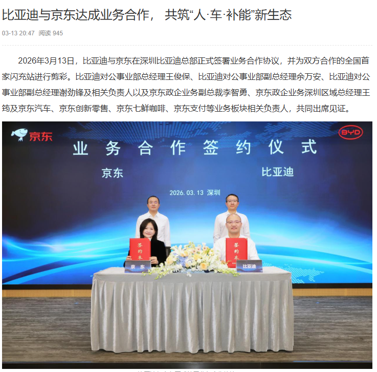 IT之家 3 月 13 日消息,今日,比亚迪与京东在深圳比亚迪总部正式签署业务合作协议,并为双方合作的全国首家闪充站进行剪彩。