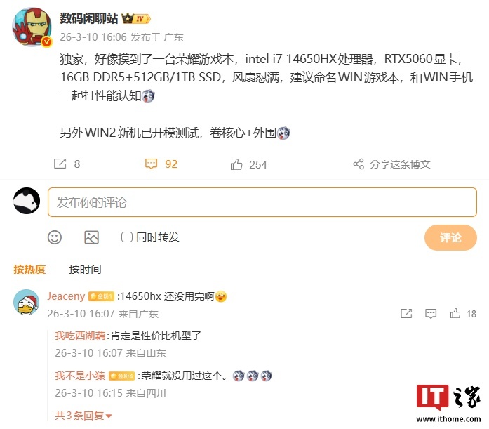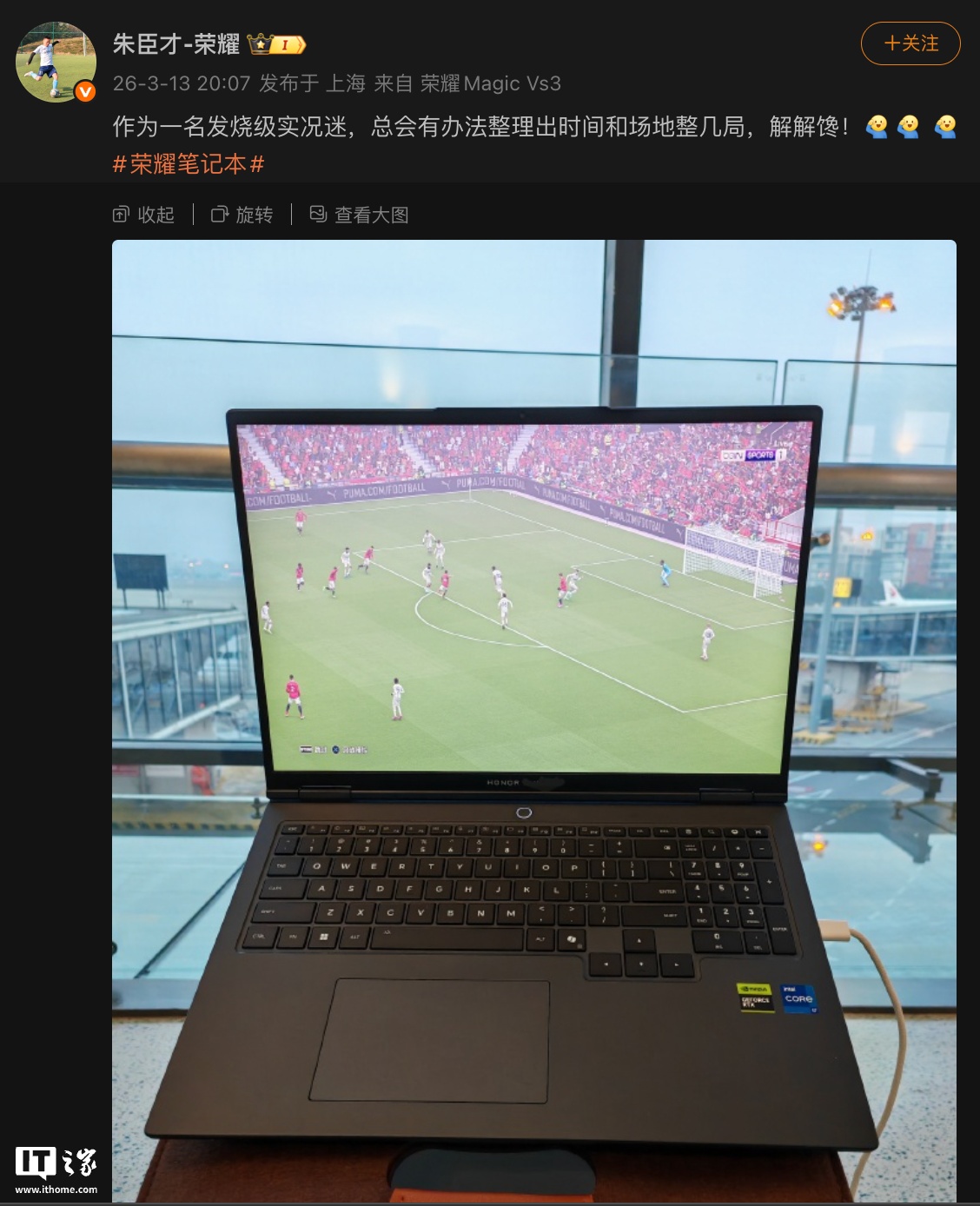 IT之家 3 月 13 日消息,荣耀 PC 产品总经理朱臣才今天在微博发文,晒出一款笔记本神秘新机。