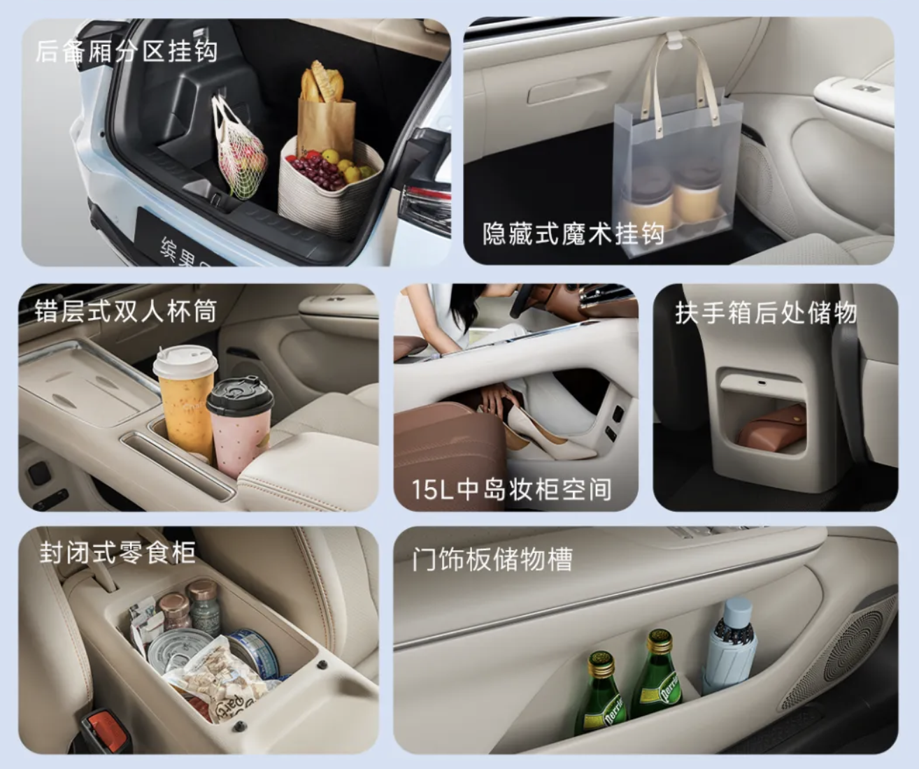 内饰方面,新车可选柔白、暖棕两种配色,配备 8.8 英寸嵌入式仪表、12.8 英寸高清触控中控,标配 6 扬声器,带有阿嘉米斯大师级声场调校,具备电动尾门、1450L 下沉式后备厢,中控则搭载 50W 风冷无线充电、3 个充电接口以及 175mm 储物槽,车机融合 Deepseek 大模型,支持 CarPlay(IT之家注:未来通过 OTA 实现)、Carlink 等互联。