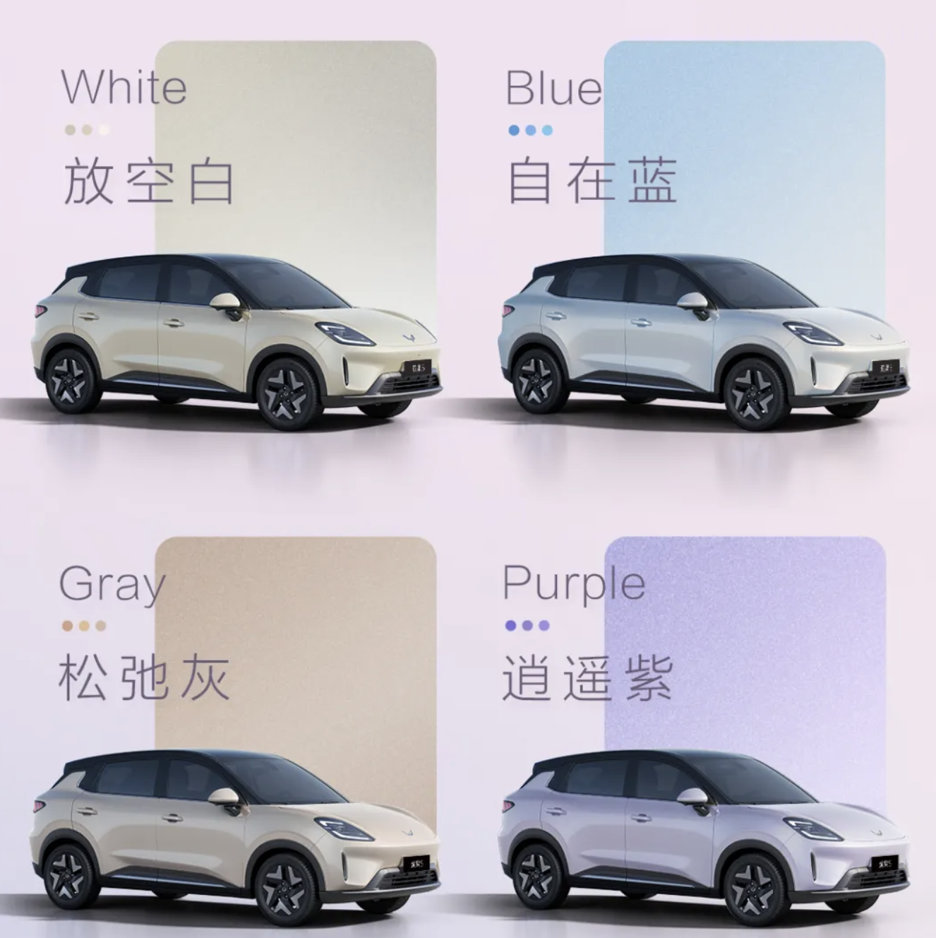 据介绍,新车主打鎏光美学设计,具备巴斯夫国际品牌车漆,可选放空白、自在蓝、松弛灰、逍遥紫 4 种配色,前脸采用“跑车式”设计,具备低风阻设计,装备飞翼式 LED 大灯,后尾则带有脉冲星环尾灯。