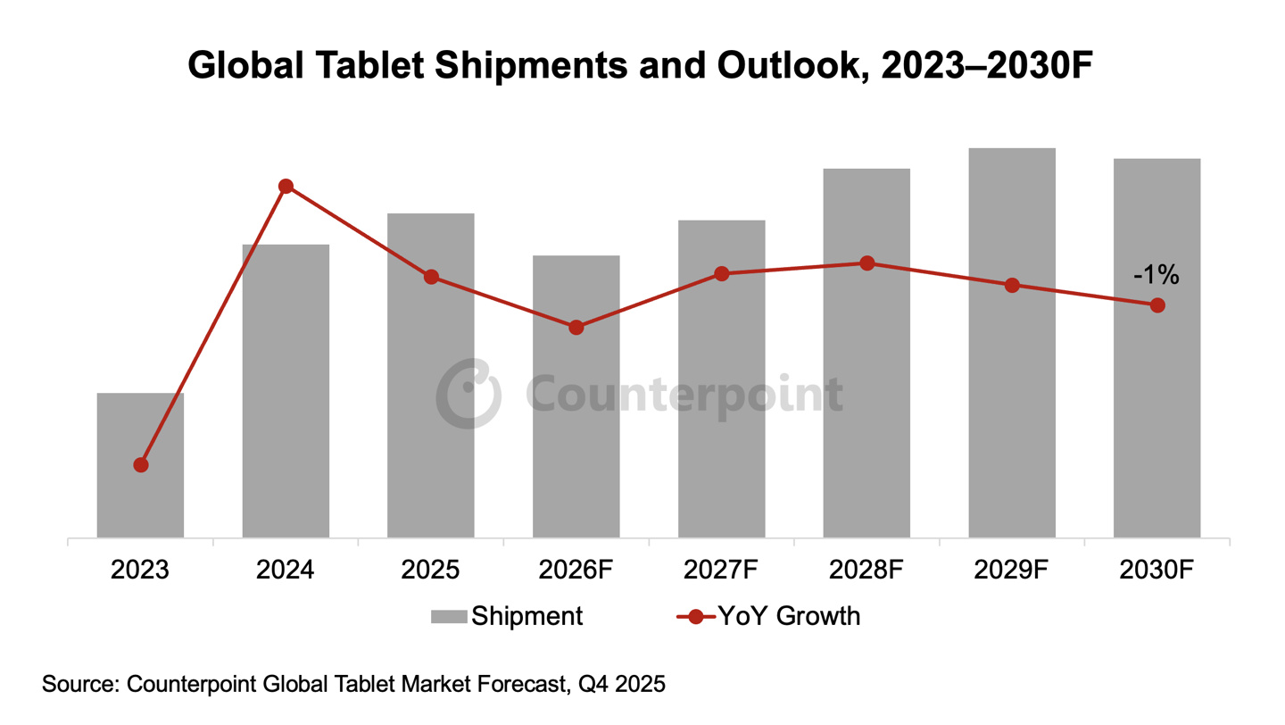 IT之家 3 月 14 日消息,市场调查机构 CounterPoint Research 昨日(3 月 13 日)发布博文,报告称 2025 年第 4 季度全球平板电脑市场步入存量消化期,出货量环比下降约 3%,同比下滑 4%。