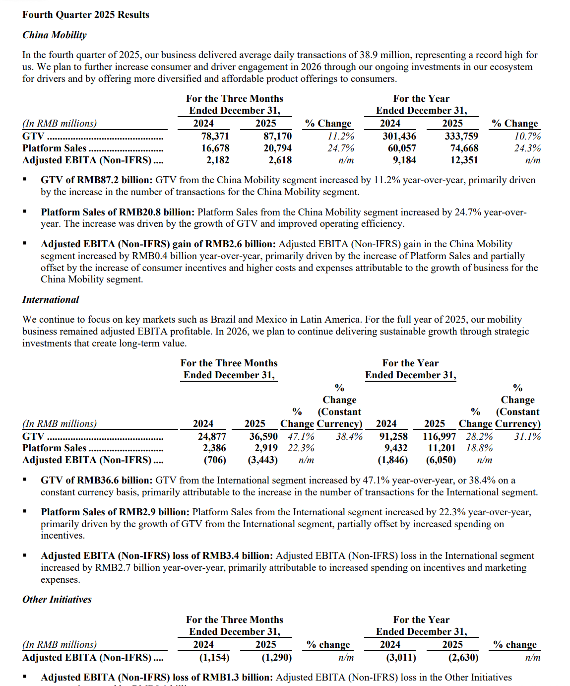 国际业务方面,2025 年第四季度 GTV 为 365.90 亿元,同比增长 47.1%,平台收入为 29.19 亿元,同比增长 22.3%。但由于加大激励和营销投入,国际业务调整后 EBITA 亏损 34.43 亿元,较上一年同期扩大。全年国际业务调整后 EBITA 亏损 60.50 亿元。