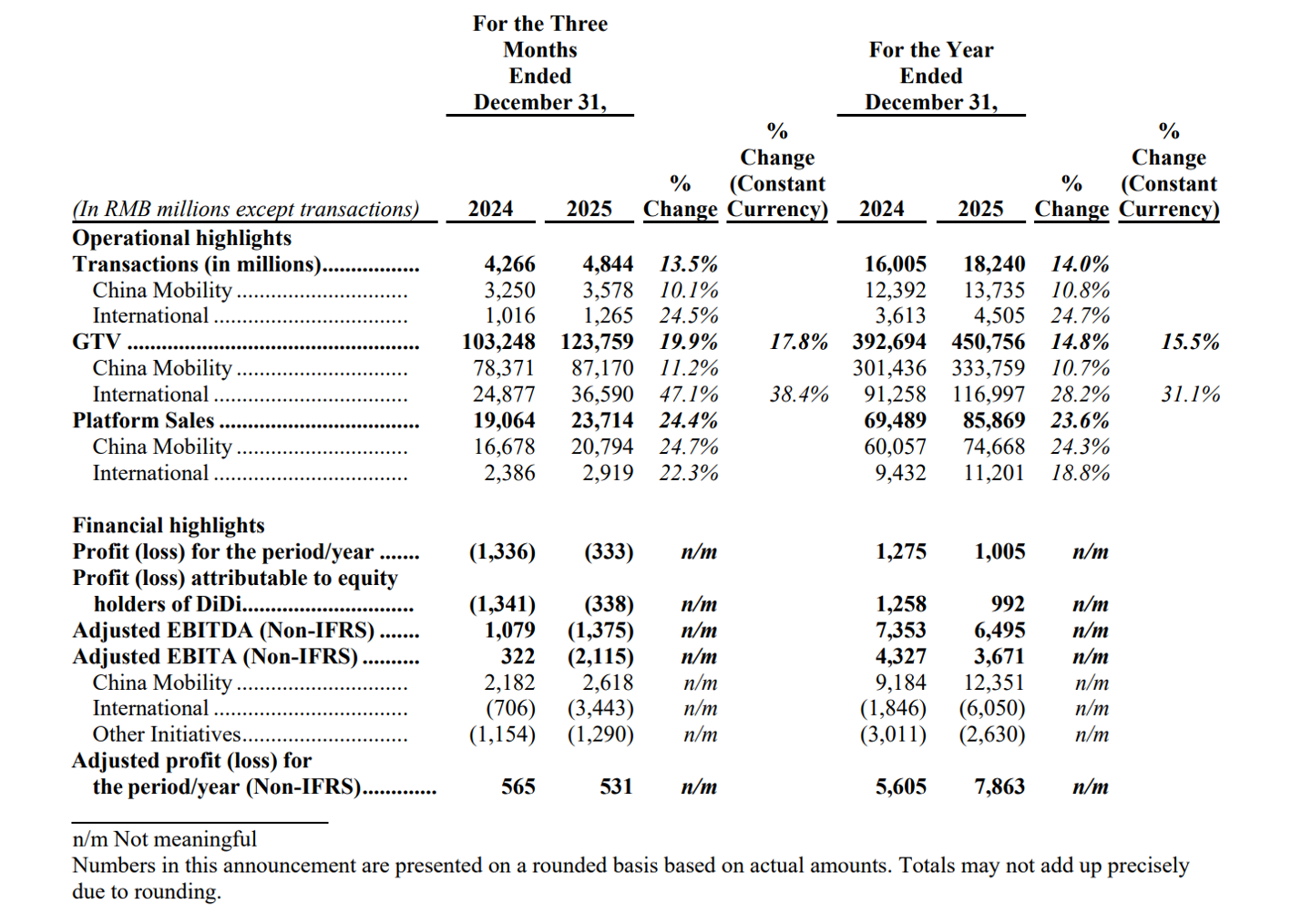 滴滴 2025 全年核心平台交易量达到 182.40 亿单,同比增长 14.0%;核心平台交易总额(GTV)达到 4507.56 亿元人民币,同比增长 14.8%。