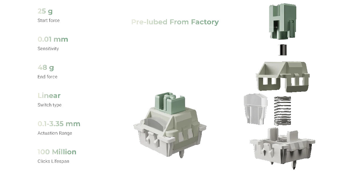据介绍,该键盘共配备 35 个按键,带有数字键、QWERT 以及 F1-F5 等按键,外壳采用 ABS 塑料,内部拥有铝合金板,键帽则是双料注塑透光 ABS,搭载 Ultra-Fast Magnetic Lime 磁轴,触发压力 25g,总键程 3.35mm,采用全 POM 结构。