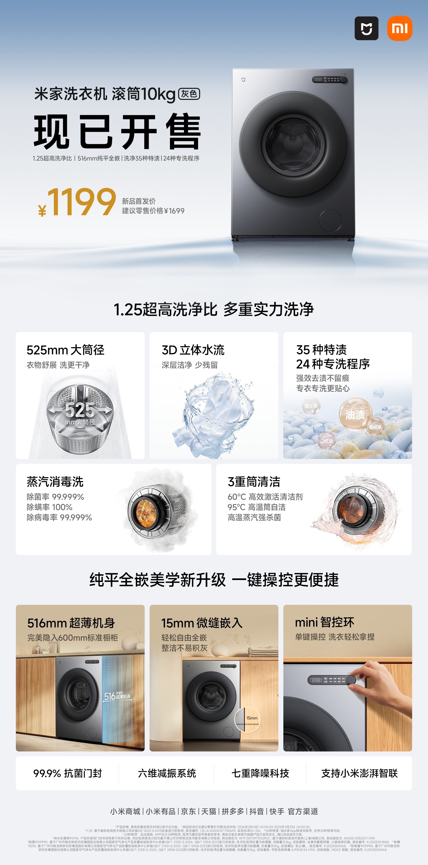 IT之家 3 月 14 日消息,据小米智能生态官微,米家洗衣机滚筒 10kg 灰色款于今晚 8 时正式开售。其建议零售价为 1699 元,新品首发价 1199 元。
