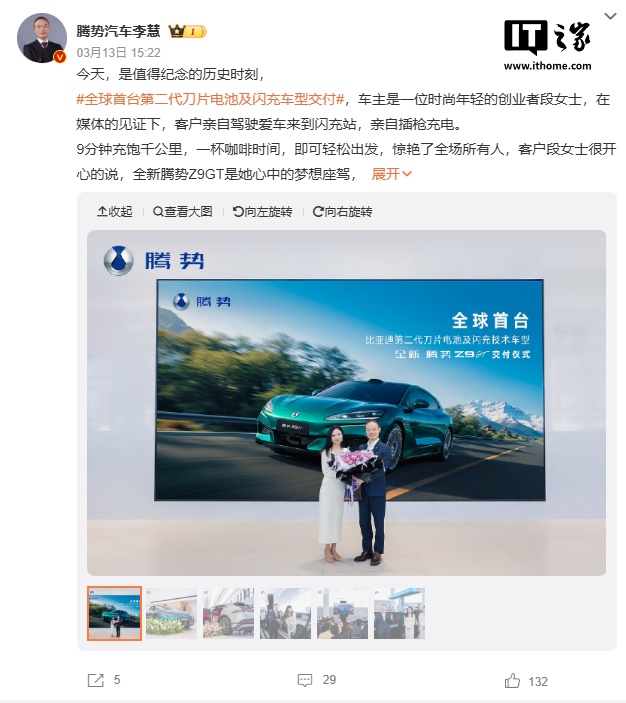 IT之家 3 月 15 日消息,全新腾势 Z9GT 已于 3 月 13 日正式交付。作为全球首台搭载比亚迪第二代刀片电池及闪充技术的量产交付车型,全新腾势 Z9GT 官方指导价 26.98 万元至 36.98 万元,CLTC 纯电续航最高可达 1036 公里,刷新了量产纯电车型的续航纪录。