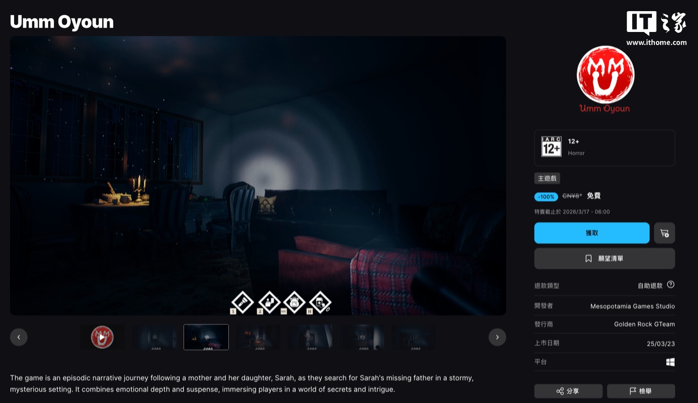 IT之家 3 月 15 日消息,由独立团队 Mesopotamia Games Studio 开发的第一人称恐怖解谜冒险游戏《Umm Oyoun》目前正在 Epic 游戏商城开启限时免费“喜加一”活动,游戏在国区原价为 8 元。