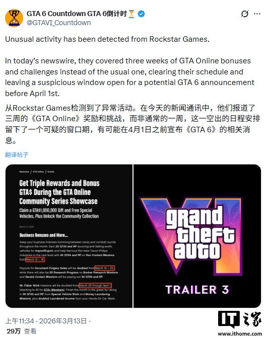 据IT之家了解,Rockstar 通常每篇新闻稿只公布一周的《 GTA Online》奖励内容,而 GTAVI_Countdown 发现,这篇博客直接放出了整整三周的奖励活动,时间从 3 月 12 日持续到 4 月 1 日。这种“一次性打包三倍内容”的操作,让一些人认为 Rockstar 是想先把这些内容一次性搞定,以便在不久后专心公布《GTA 6》的更新消息。