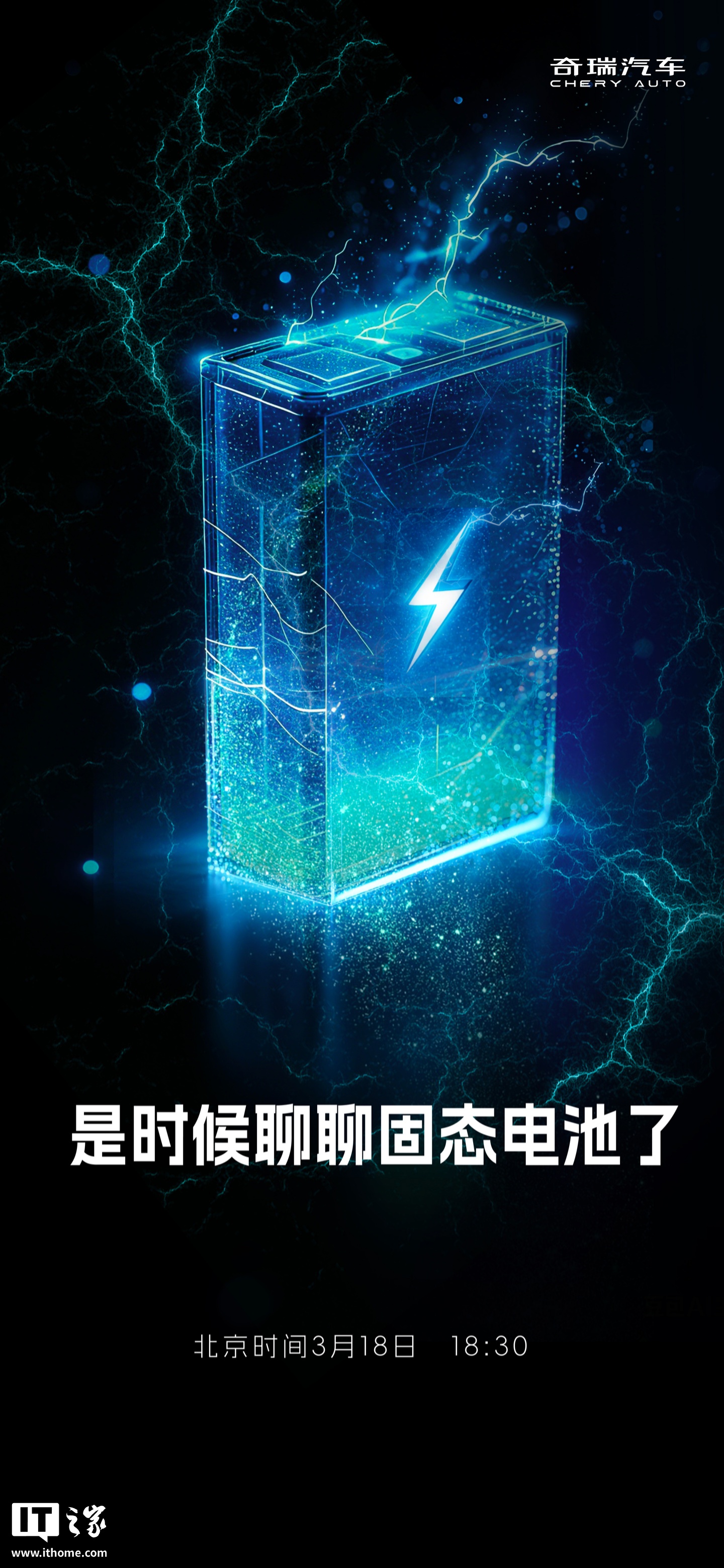 IT之家 3 月 16 日消息,奇瑞汽车今日官宣,2026 奇瑞汽车电池之夜定档 3 月 18 日 18:30,官方宣传语为“是时候聊聊固态电池了”。