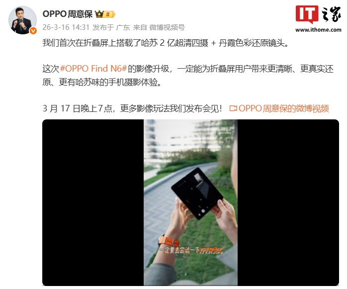OPPO Find 系列产品负责人周意保今日发布视频,详细介绍了 Find N6 的影像能力,新机确认首次搭载哈苏 2 亿超清四摄 + 丹霞色彩还原镜头。