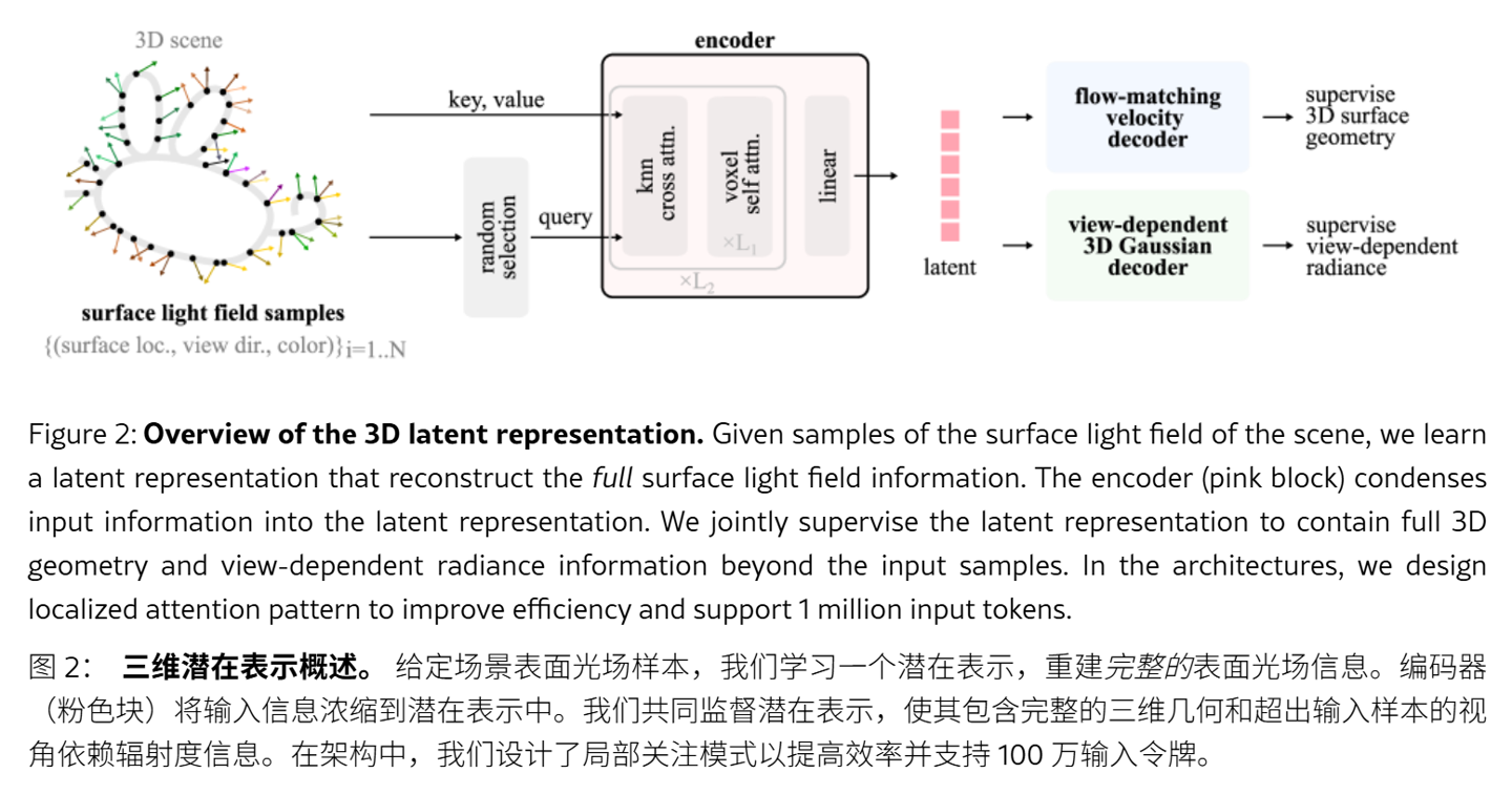 LiTo 模型首创了一种统一的 3D 潜在表示法,将随机采样的表面光场数据编码为紧凑的向量集。这意味着模型无需死记硬背每一个视觉细节,而是通过数学描述,同时掌握了对象的物理形状以及光线与其表面交互的底层规律。