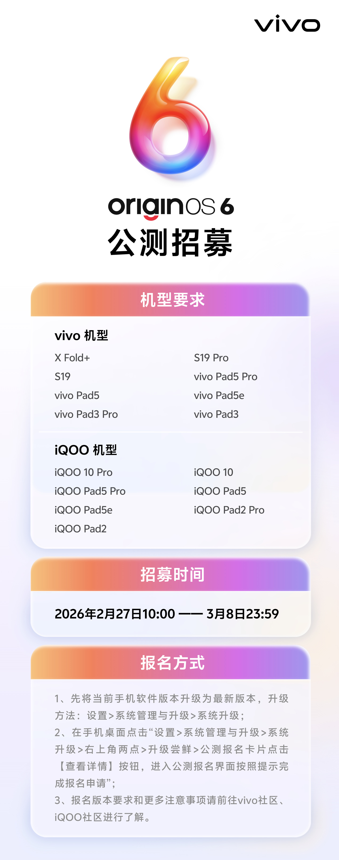 今年 2 月 27 日,vivo 宣布全新系统 OriginOS 6 最新公测招募开启,涵盖 vivo X Fold+、iQOO 10 等机型。