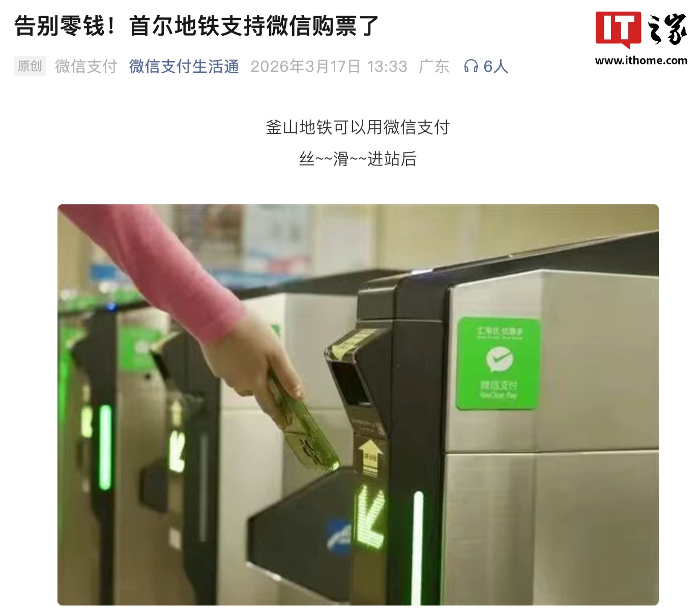 IT之家 3 月 17 日消息,据“微信支付生活通”公众号今日发文,韩国首尔市内地铁自助售票机现已接入微信支付,中国游客无需携带现金即可购买单程票。