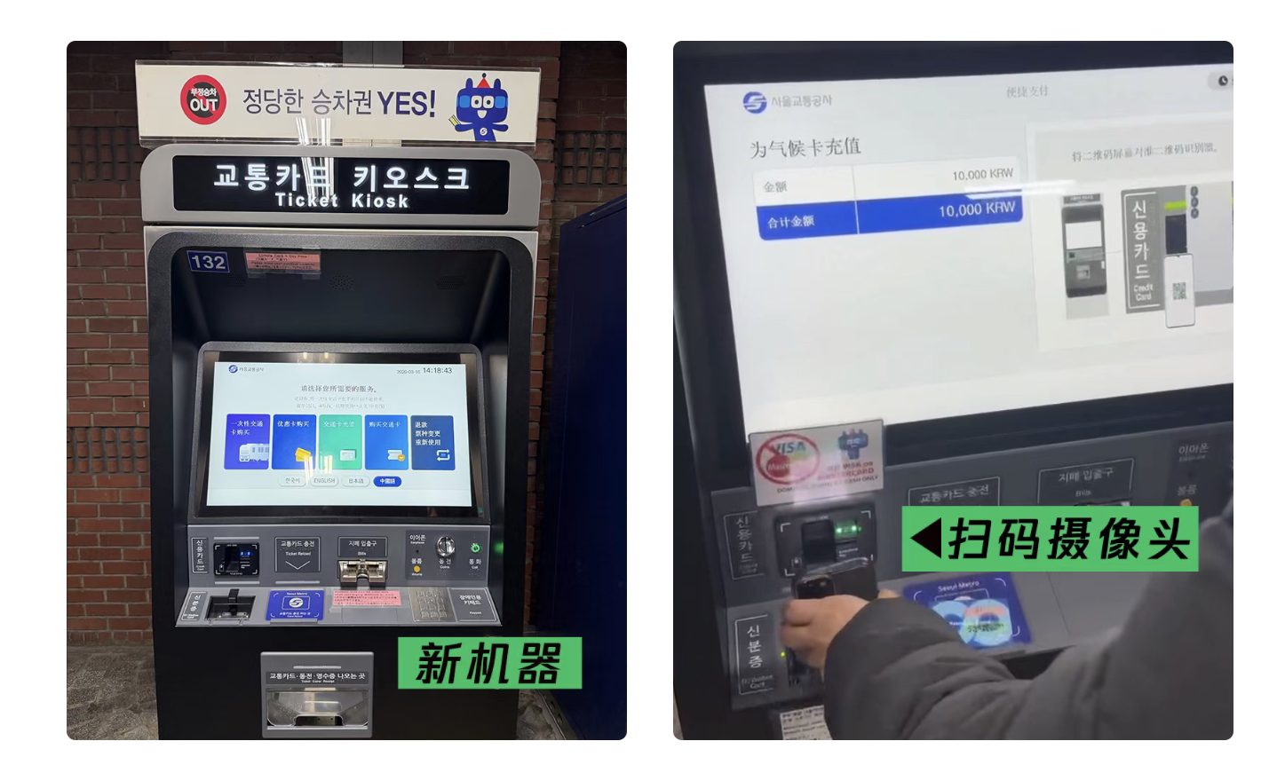 据悉,首尔地铁 1-8 号线全站现已安装新型灰色自助售票机,旅客朋友们可以在这些机器上用微信支付购票,付款时把二维码对准左侧的扫码摄像头就行,听到“哔”的一声就能拿到单程票。