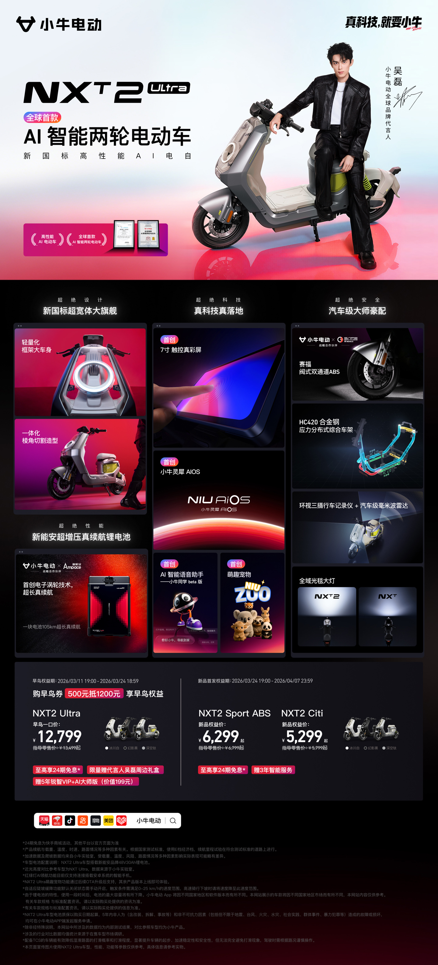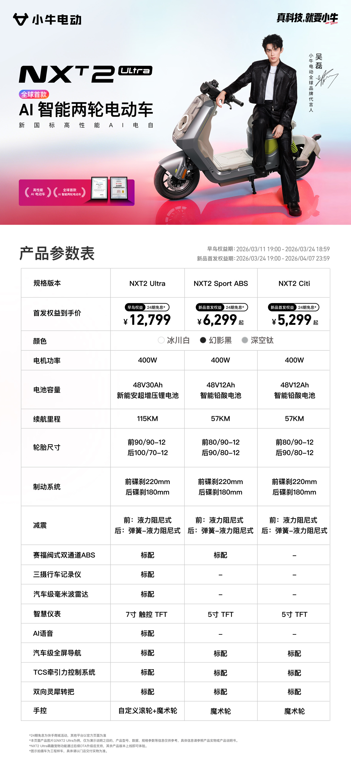 小牛还推出了 NXT2、NX2 两款旗舰电动车,分别瞄准都市精英与性能玩家。其中 NXT2 定位“全球首款 AI 新国标电动自行车”,采用 HC420+Q20 高强度车架,并配备全域光毯大灯、赛福 ABS+TCS 及 10 大落地智能功能。NXT2 Ultra 版零售指导价为 13499 元,通过早鸟预定首发到手价为 12799 元,发布即开售。