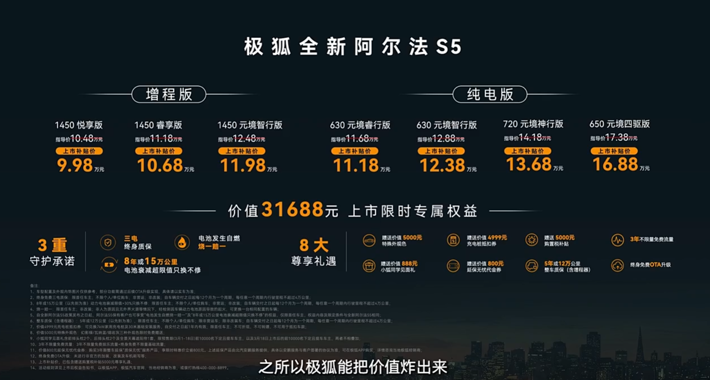 IT之家 3 月 18 日消息,极狐全新阿尔法 S5 车型今日正式上市,可选纯电和增程版本,首发上市补贴价 9.98 万元起。