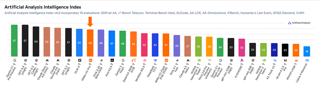 Xiaomi MiMo-V2-Pro 专为现实世界中高强度的 Agent 工作场景而打造。其拥有超过 1T 的总参数量(42B 激活参数),采用创新的混合注意力架构,并支持 1M 超长上下文长度。小米还在更为广泛的 Agent 场景中持续 Scaling 算力,进一步拓展了智能的动作空间,实现了从 Coding 到 Claw 的重要泛化。在 Artificial Analysis 排行榜上,MiMo-V2-Pro 位列全球第八,国内第二。