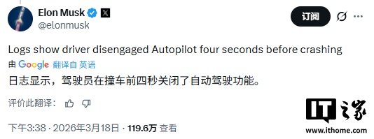 IT之家注意到,马斯克昨日在 X 平台发文称,驾驶日志已经显示,驾驶员在碰撞前四秒主动关闭了 Autopilot 。