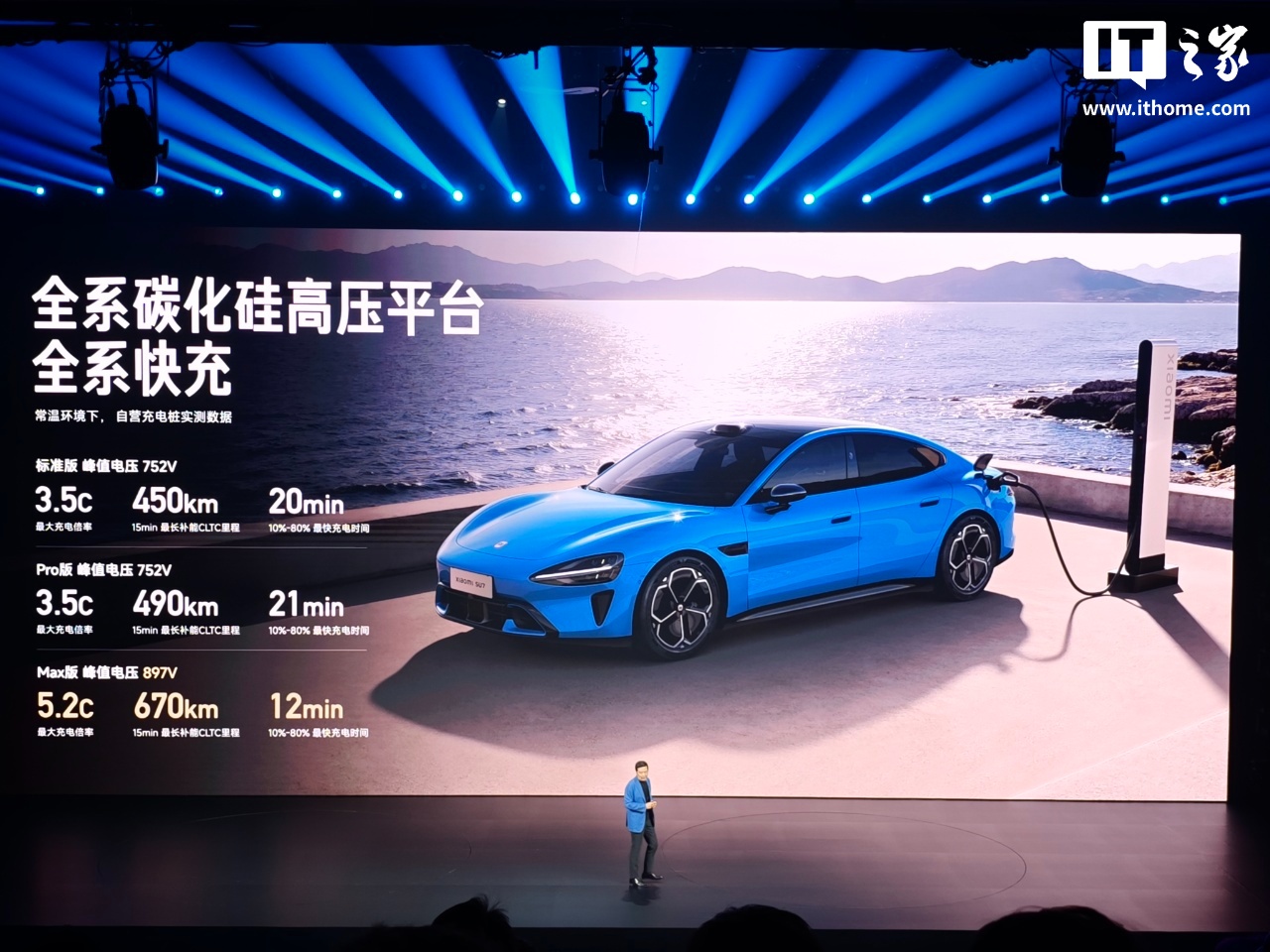 新一代 SU7 还全系具备长续航特性,Pro 版 CLTC 续航 902km、Max 版 CLTC 续航 835km、标准版 CLTC 续航 720km。另外,新车还全系采用碳化硅高压平台,Max 版最大充电倍率 5.2C,10%-80% 最快充电时间 12 分钟。