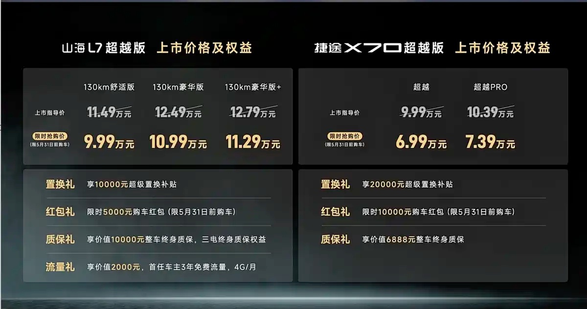 IT之家 3 月 19 日消息,2026 款捷途山海 L7 超越版、2026 款捷途 X70 超越版已上市,其中捷途山海 L7 超越版推出 3 款车型,售价区间为 11.49-12.79 万元,限时抢购价 9.99-11.29 万元。该车搭载奇瑞鲲鹏 1.5TGDI 混动专用发动机,可实现 7 秒级零百加速,百公里馈电油耗 5.18L,满油满电综合续航超 1300km。捷途 X70 超越版售价区间为 9.99-10.39 万元,限时抢购价 6.99-7.39 万元,定位“宽体舒适大七座燃油 SUV”。