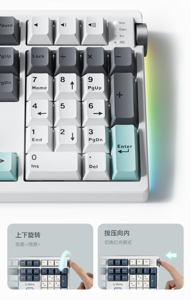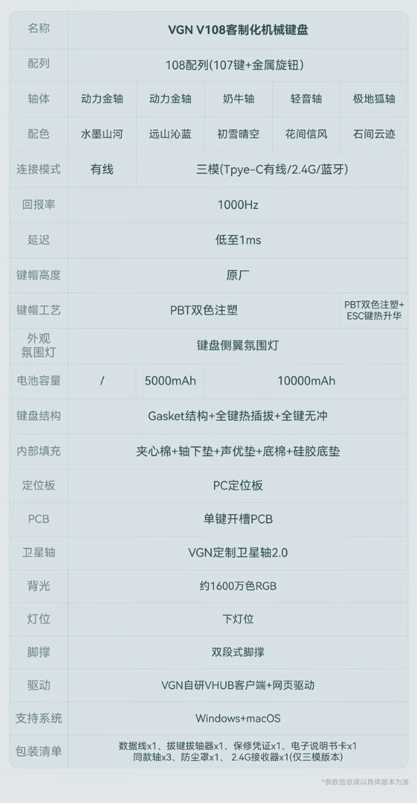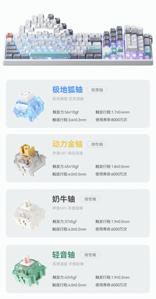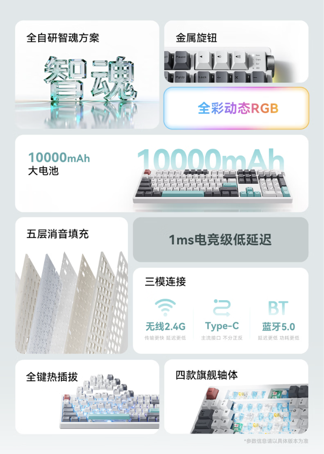 系列键盘提供 1KHz 回报率,其中动力金轴版本内置 5000 毫安时电池,而奶牛轴、轻音轴、极地狐轴内置 10000 毫安时电池。