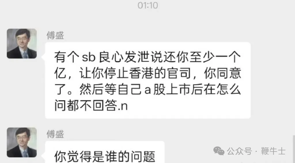 他补充称,“有个 xx 良心发现说还你至少一个亿,让你停止香港的官司,你同意了。然后等自己 A 股上市后再怎么问都不回答,你觉得是谁的问题”。