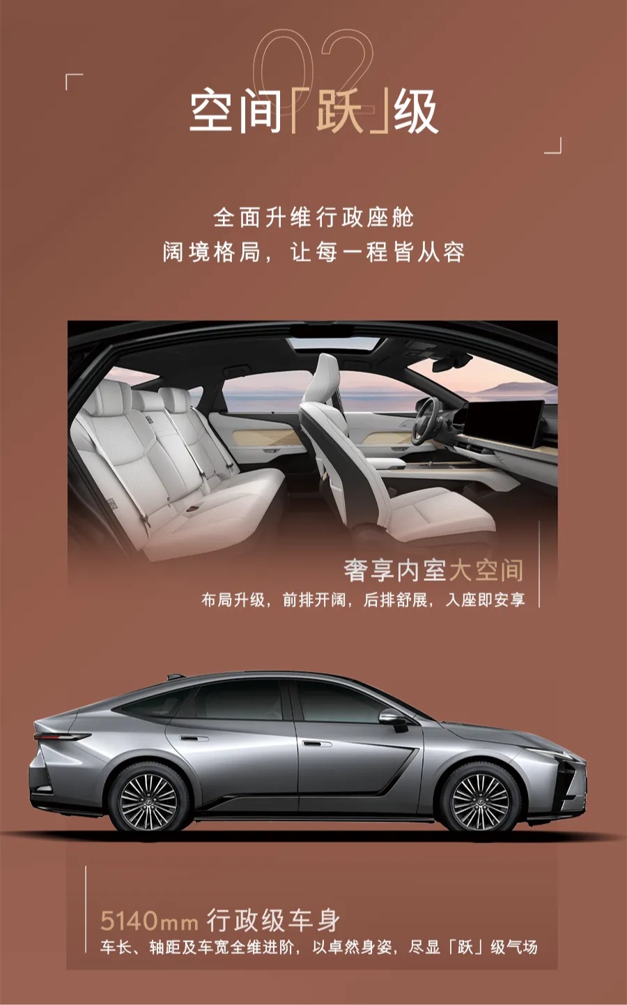 车身尺寸方面,新车相比上一代车型有明显提升,车身长度增加 165mm 达到 5140mm,轴距加长 80mm 至 2950mm。宽度和高度分别达到 1920mm 和 1555mm。
