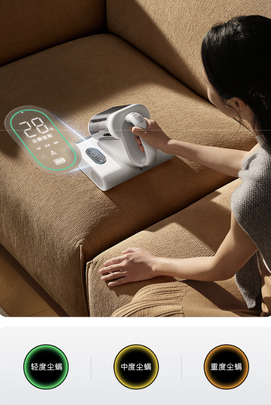 该除螨仪提供 17000Pa 吸力,可实现 72000 次 / 分钟高频拍扫,整机过滤效率 99%;还有快充技术加持,内置 2500 毫安时电池最长续航可达 30 分钟。