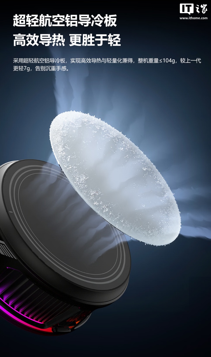 此外,这款散热器内置双 NTC 温感芯片和 AI 温控算法,能够智能调控转速、避免过度制冷,需搭配 40W 及以上充电头才能发挥最佳性能。