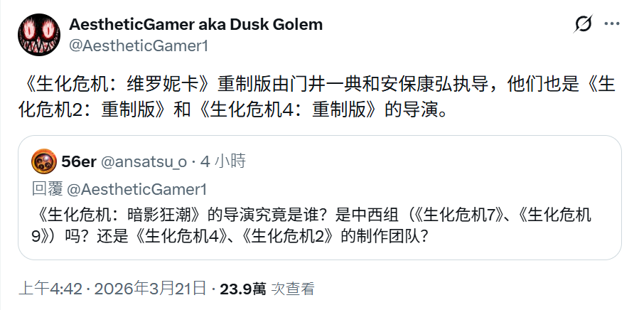 IT之家 3 月 21 日消息,知名爆料人士 Dusk Golem 昨天在 X 平台透露,卡普空正在开发《生化危机:代号维罗妮卡》重制版,由《生化危机 2 重制版》《生化危机 4 重制版》导演门井一宪、安保康弘主导开发。