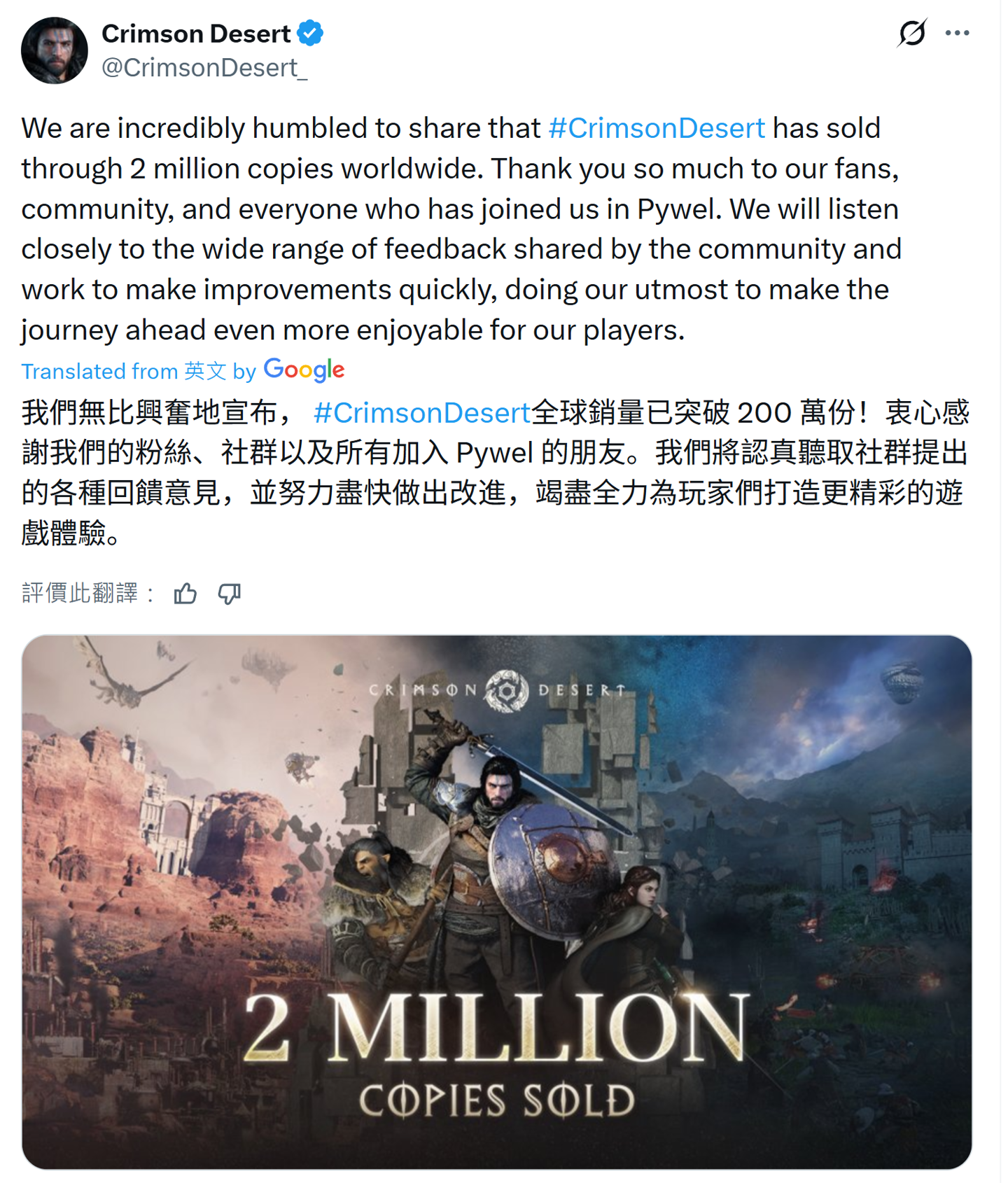 IT之家 3 月 21 日消息,《红色沙漠》游戏发售首日全球销量突破 200 万份。官方昨天在 X 平台表示,衷心感谢所有粉丝、社群以及所有加入 Pywel 的朋友。官方将认真听取社群提出的各种反馈意见,并尽快做出改进。