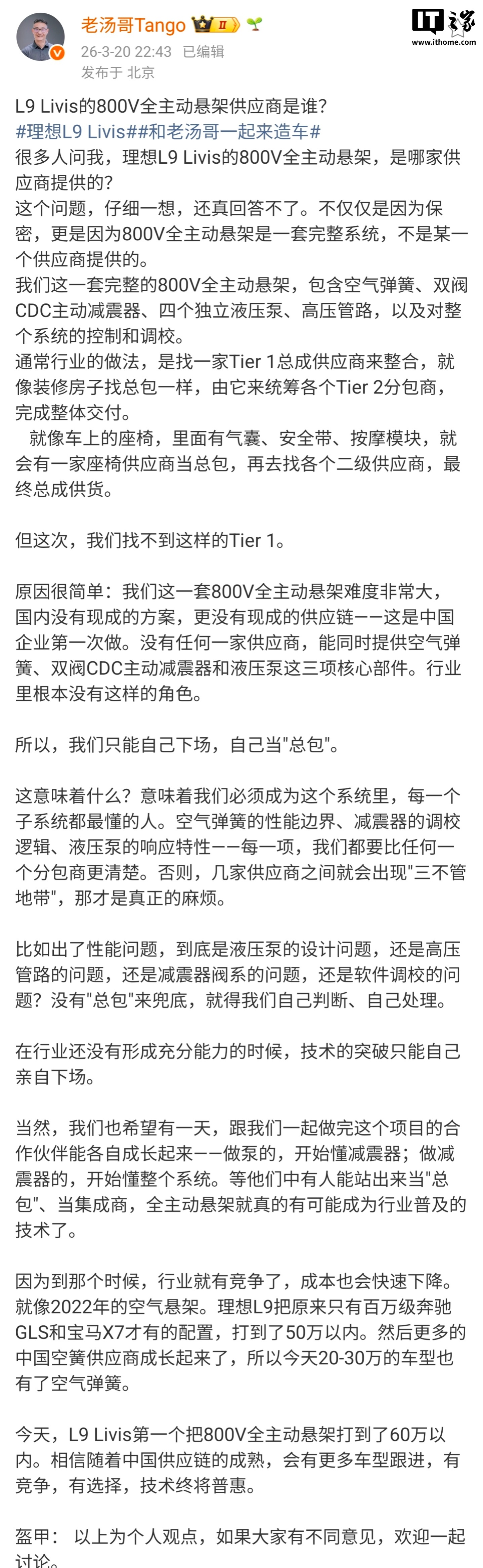 IT之家 3 月 21 日消息,今日,理想汽车产品线负责人汤靖回应了“L9 Livis 的 800V 全主动悬架供应商是谁”。
