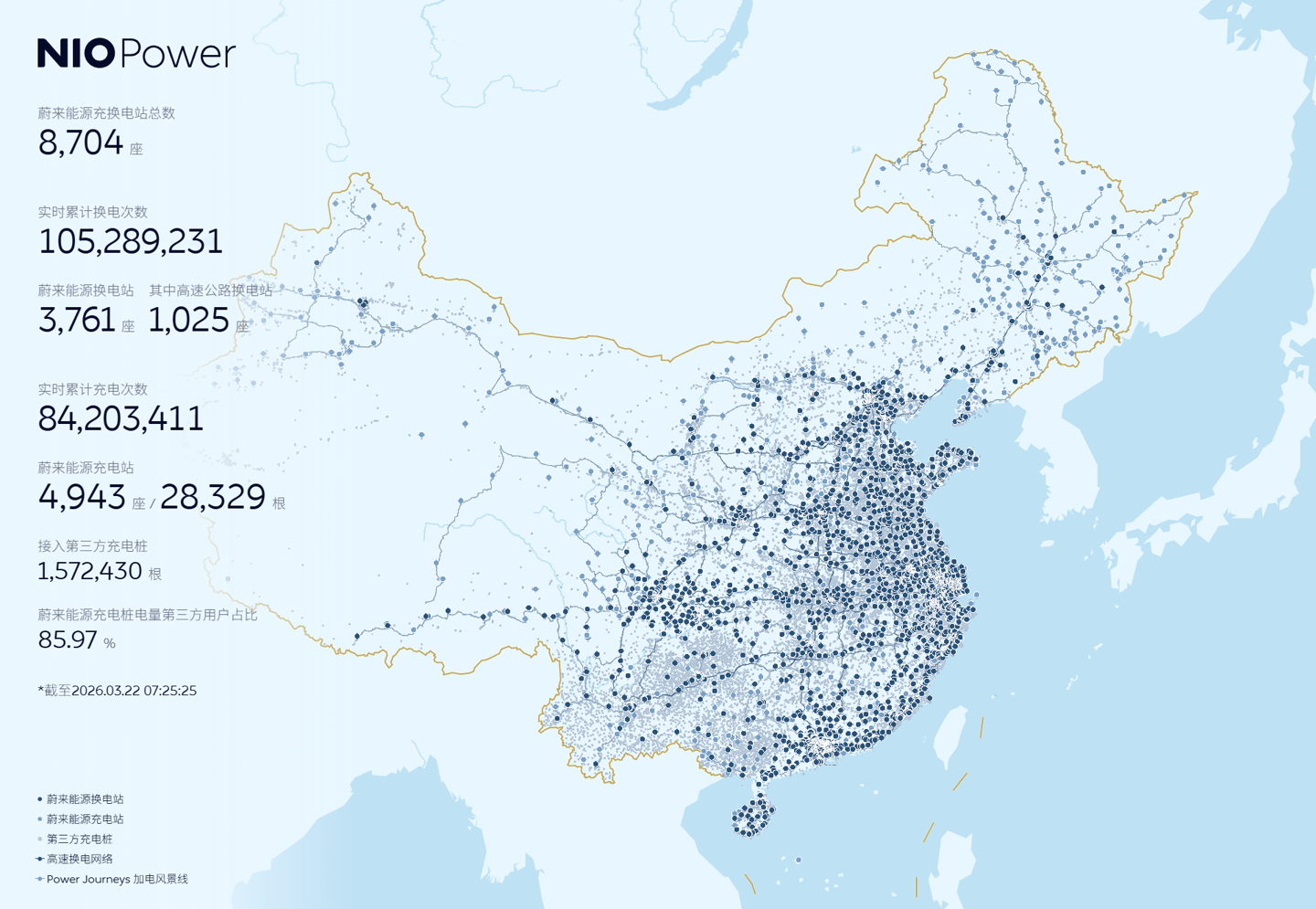目前,蔚来能源充换电站总数已达到 8704 座:蔚来能源换电站 3761 座,其中高速公路换电站 1025 座;蔚来能源充电站 4943 座,接入第三方充电桩 1572430 根。