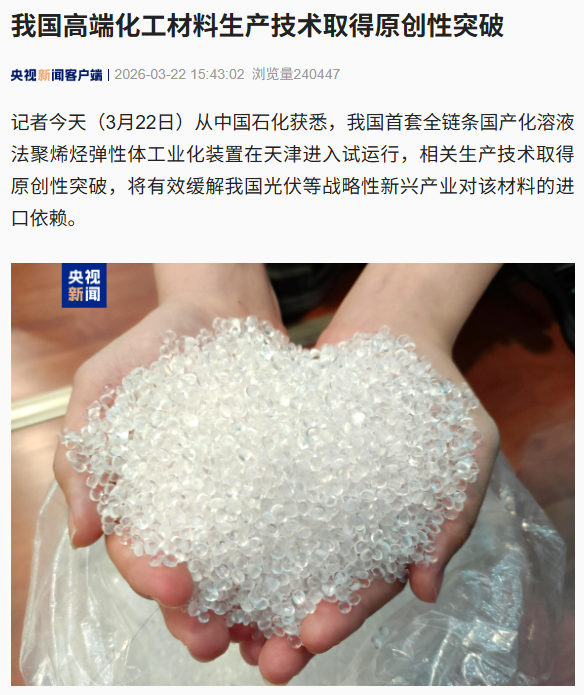 IT之家 3 月 22 日消息,据央视新闻报道,记者今天从中国石化获悉,我国首套全链条国产化溶液法聚烯烃弹性体工业化装置在天津进入试运行,相关生产技术取得原创性突破,将有效缓解我国光伏等战略性新兴产业对该材料的进口依赖。