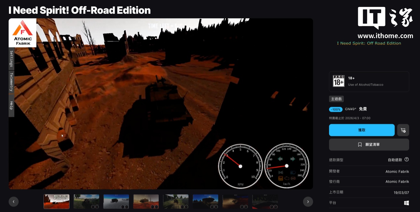 IT之家 3 月 23 日消息,越野驾驶题材游戏《I Need Spirit!Off-Road Edition》现已在 Epic 游戏商店开启限时免费“喜加一”活动,本次限免并非平台官方活动,而是由开发者自行发起的特别促销,玩家可以在北京时间 4 月 3 日 7:00 前免费领取,本作在 Epic 国区定价为 9 元,游戏商品页。