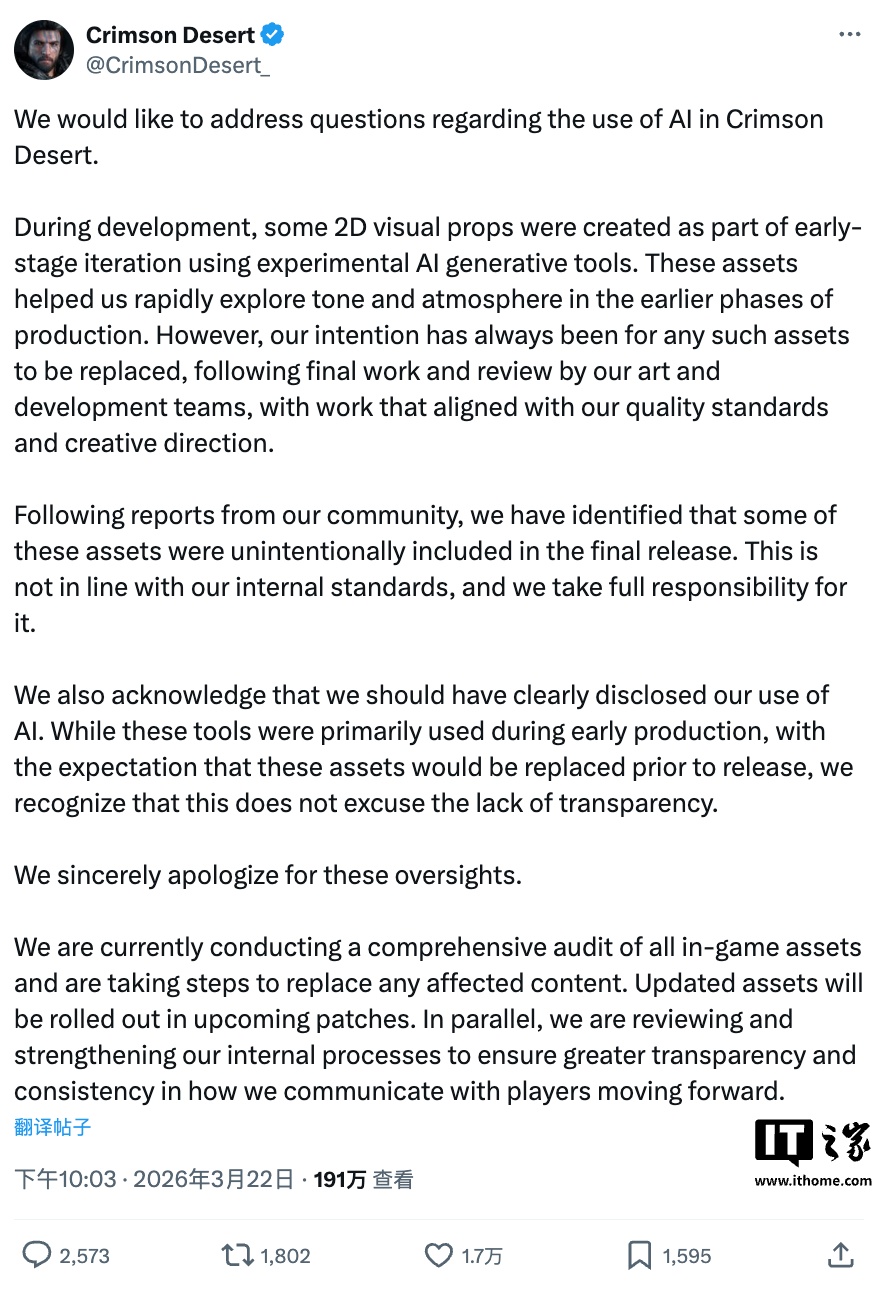 对此,开发商 Pearl Abyss 在 X 平台发文回应,称游戏在开发过程中使用了部分使用“实验性 AI 工具”生成的“2D 视觉道具”作为占位符,但忘记在游戏上线前进行替换。
