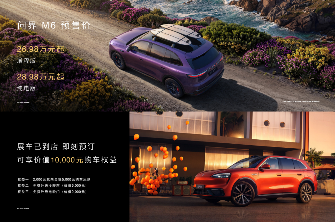 价格方面,问界 M6 增程版预售价 26.98 万元起、纯电版预售价 28.98 万元起,即刻预订可享价值 10000 元购车权益。