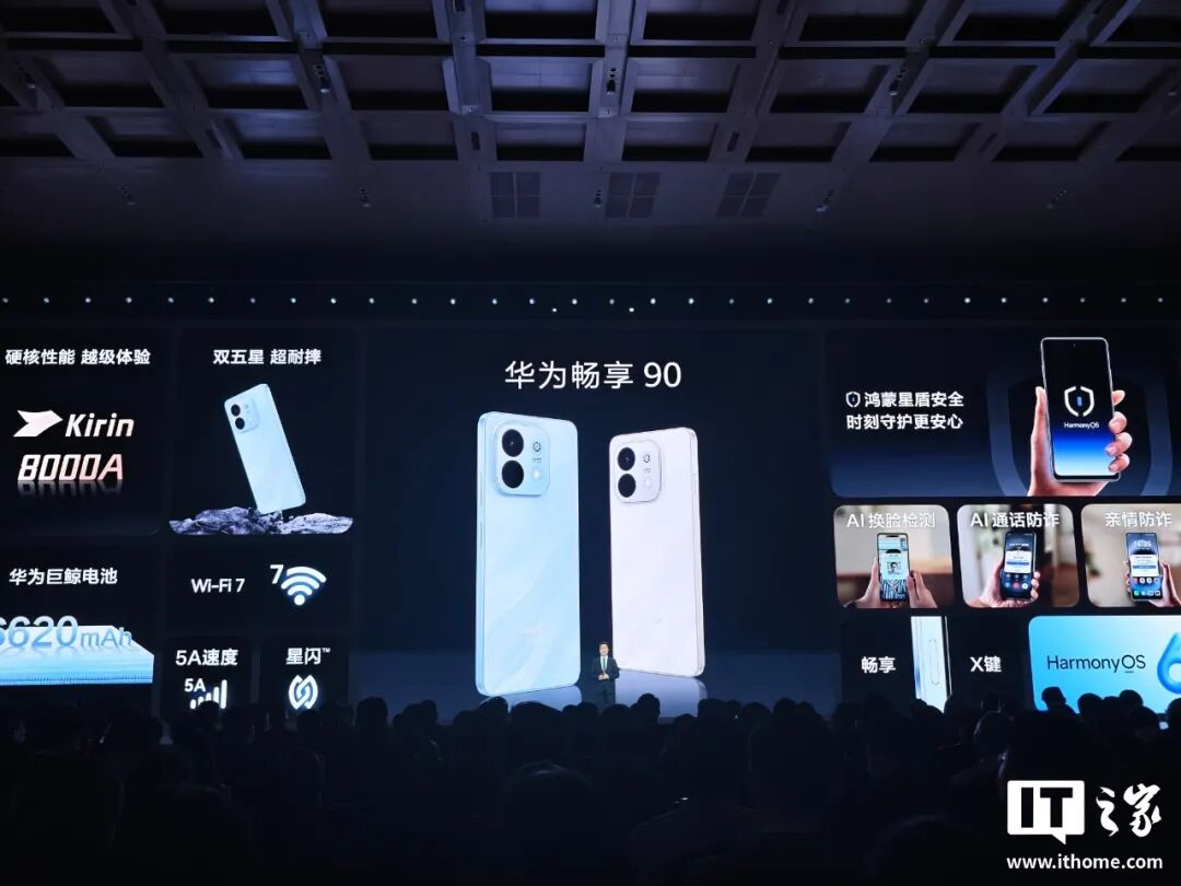 最后还有个畅享 90,核心配置如下图所示:麒麟 8000A,HarmonyOS 6、6620mAh 巨鲸电池、Wi-Fi 7、5A 速度、星闪、鸿蒙星盾安全、畅享 X 键。