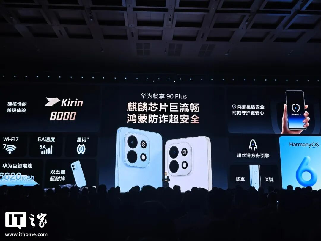 再来看看畅享 90 Plus,该机同样搭载麒麟 8000,内置 HarmonyOS 6,支持 5A 速度和 Wi-Fi 7,整机性能提升 67%。