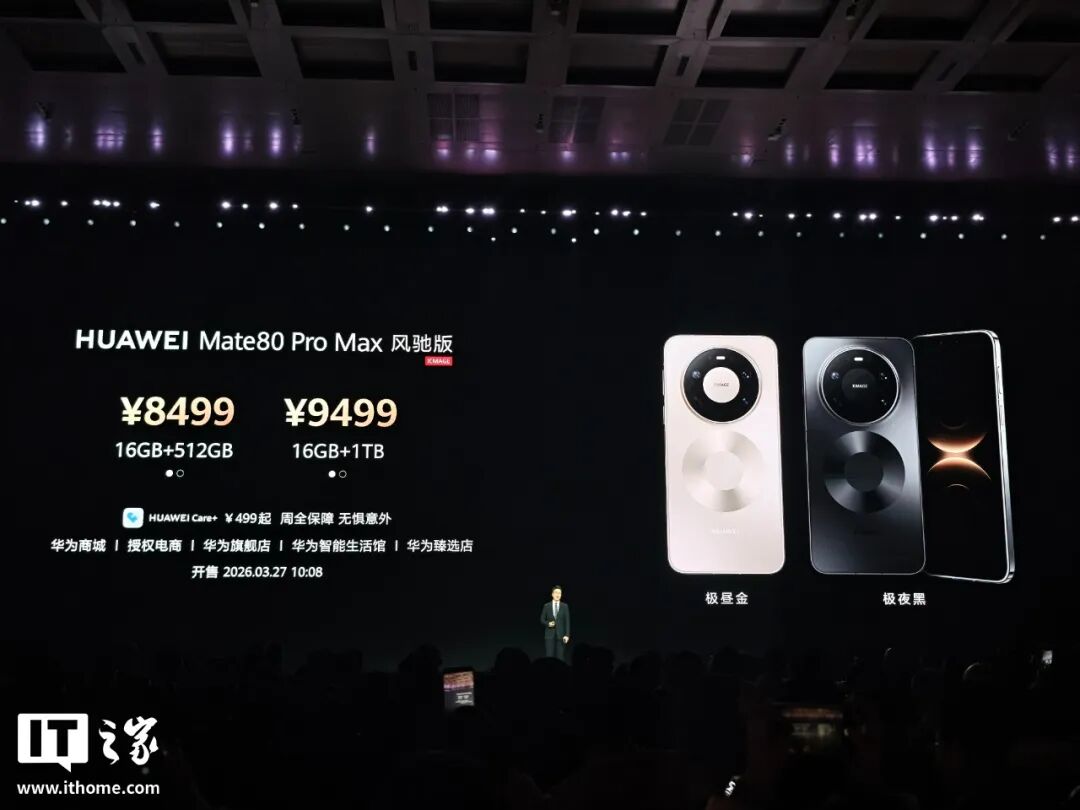 价格方面,Mate 80 Pro Max 风驰版提供 16GB+512GB、16GB+1TB 两个版本,售价分别为 8499 元、9499 元。