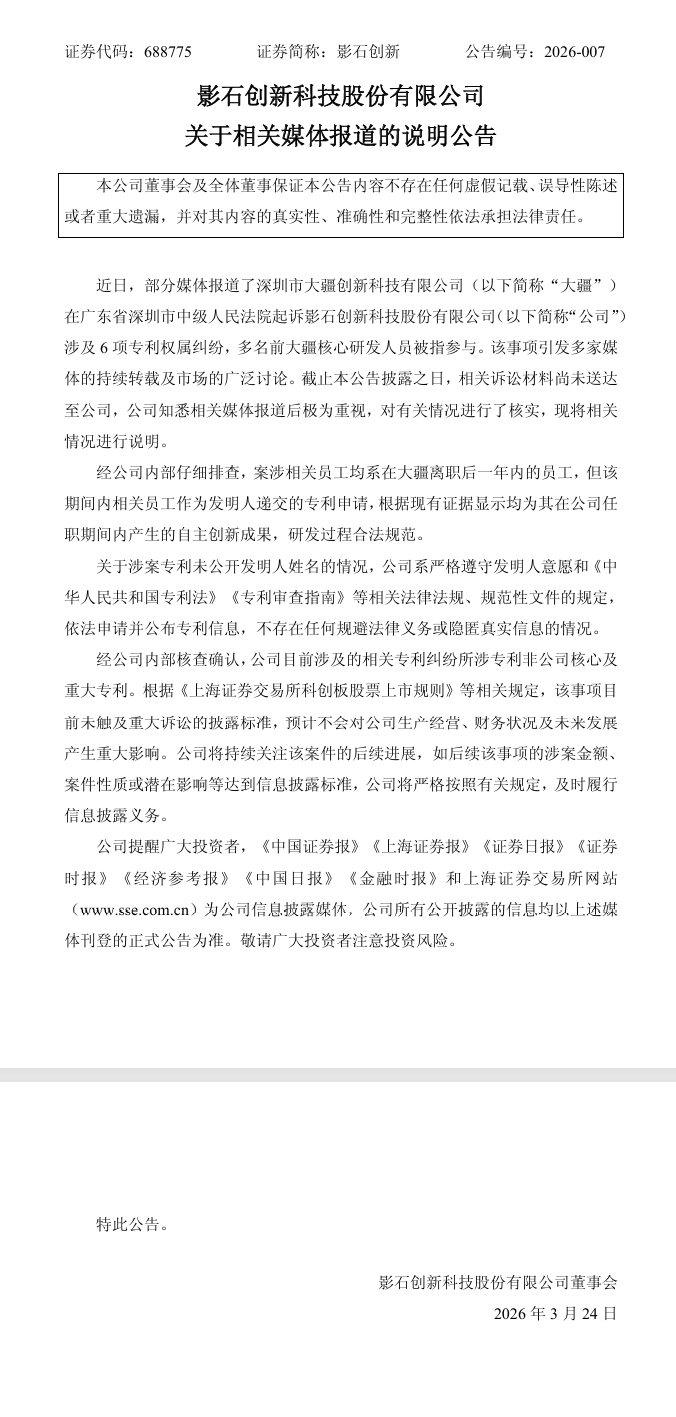 公告称,近日,部分媒体报道了深圳市大疆创新科技有限公司(IT之家注:以下简称“大疆”)在广东省深圳市中级人民法院起诉影石创新科技股份有限公司(以下简称“公司”)涉及 6 项专利权属纠纷,多名前大疆核心研发人员被指参与。该事项引发多家媒体的持续转载及市场的广泛讨论。截止本公告披露之日,相关诉讼材料尚未送达至公司,公司知悉相关媒体报道后极为重视,对有关情况进行了核实,现将相关情况进行说明。