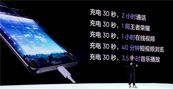 根据发布会现场测试,仅需80秒即可将1%电量充至20%,官方称,充电30秒可进行2小时通话、1局《王者荣耀》、1小时在线视频或40分钟短视频浏览等,可以说进入了手机快充进入“读秒”时代。